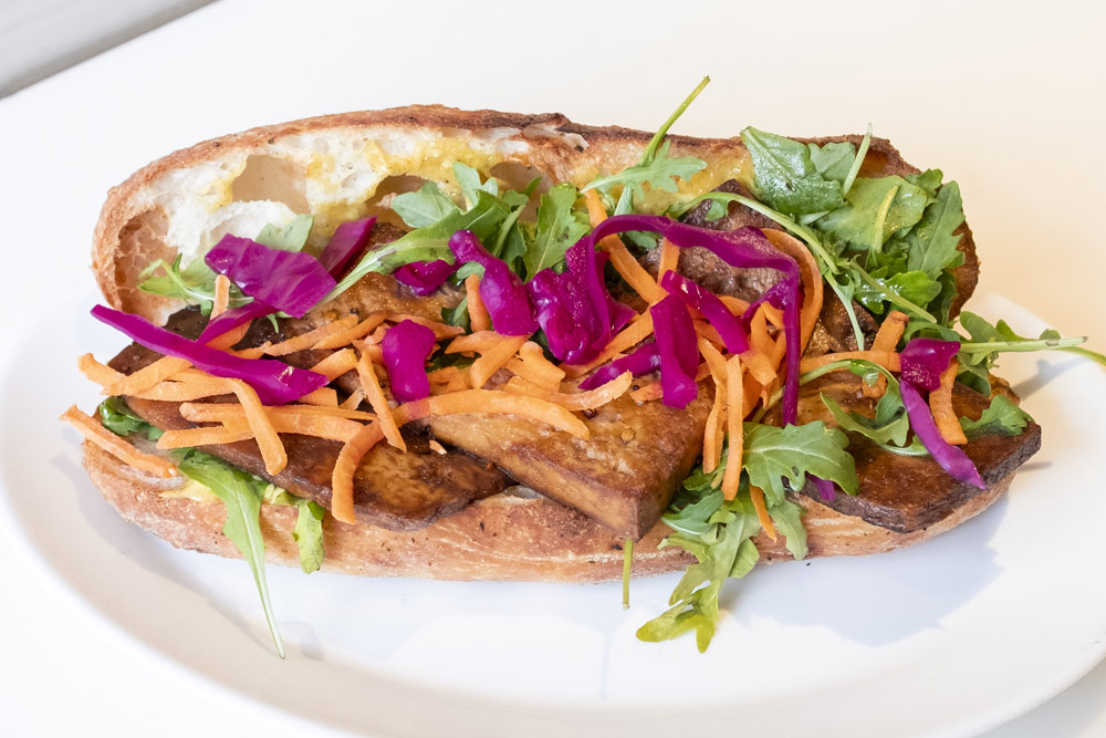 Tofu mariné, carottes râpées, chou rouge mariné, roquette et mayonnaise au cari et à l’ail. Servi avec salade cesar ou jardinière.